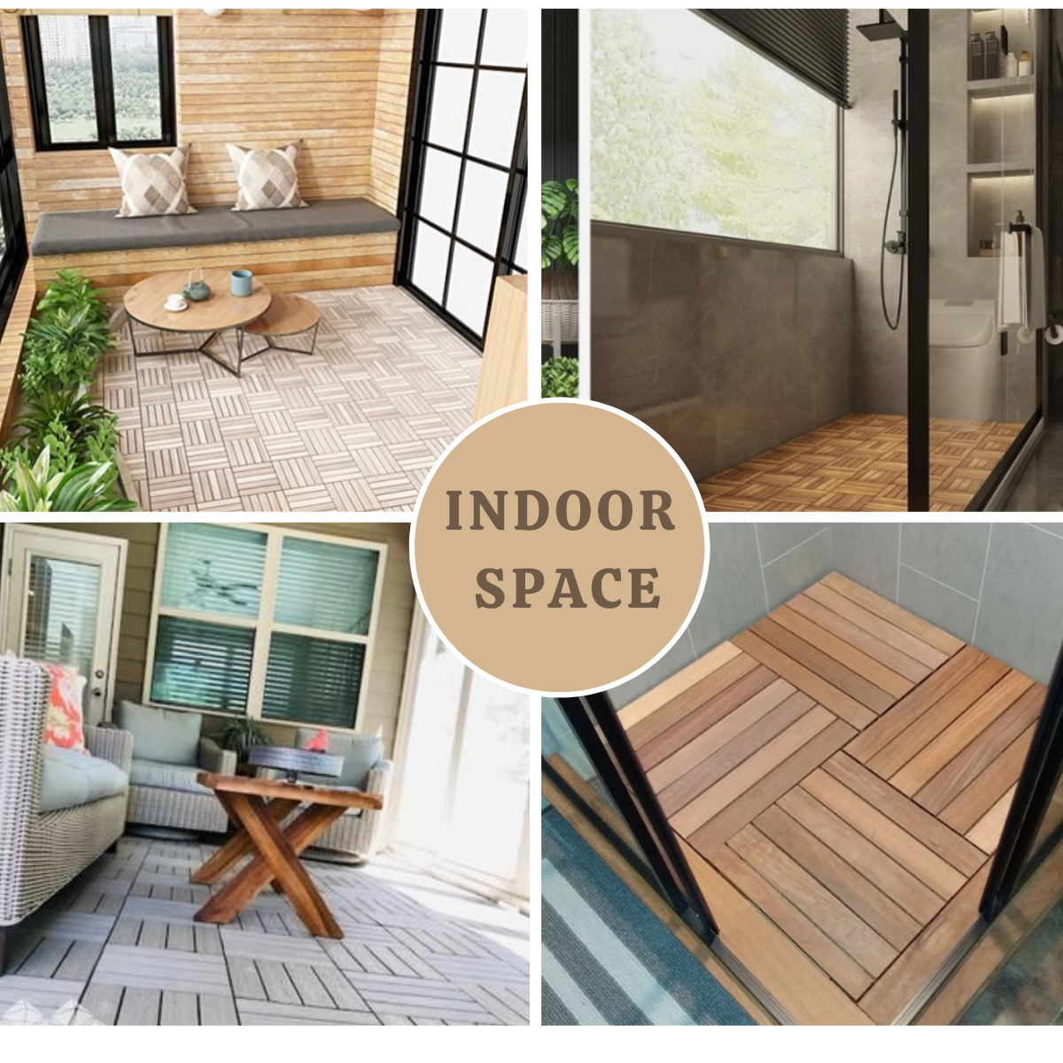 Apply wood deck tiles to a designated area indoors, such as an entryway or a sunroom, or a bathroom. This can bring a touch of the outdoors inside and create a seamless transition between indoor and outdoor spaces.
