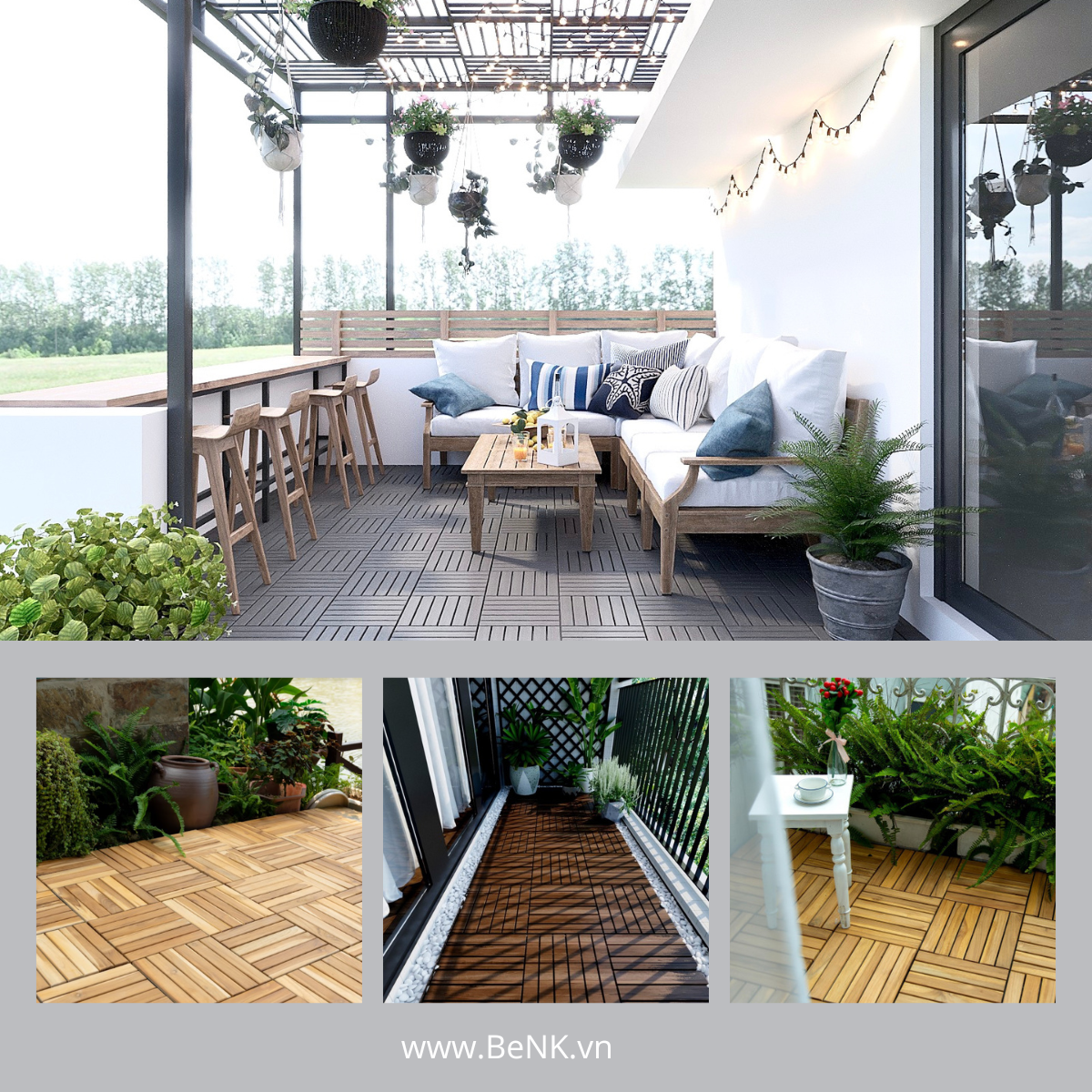 Create an outdoor seating area by arranging wood deck tiles to cover your patio or balcony. Add comfortable outdoor furniture like chairs, sofas, and a coffee table to complete the look.